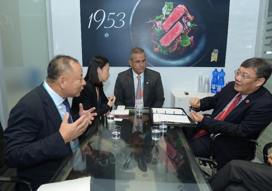 11月7日上午,陳希濱董事長陪同黑龍江省省長王文濤、副省長程志明,與參加進(jìn)博會(huì)的全球500強(qiáng)企業(yè)巴西JBS集團(tuán)CEO雷納托·科斯塔舉行了會(huì)談。會(huì)談中,王文濤省長表示黑龍江省政府將積極推動(dòng)JBS與黑龍江企業(yè)開展合作,推動(dòng)龍江畜牧業(yè)及肉制品加工業(yè)更好發(fā)展,實(shí)現(xiàn)互利共贏。