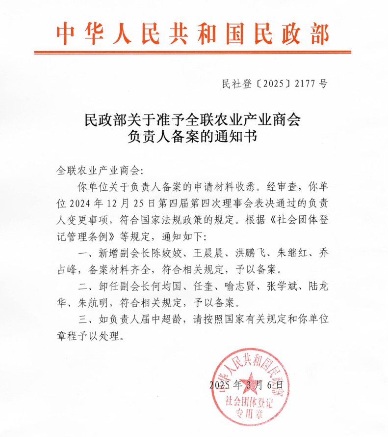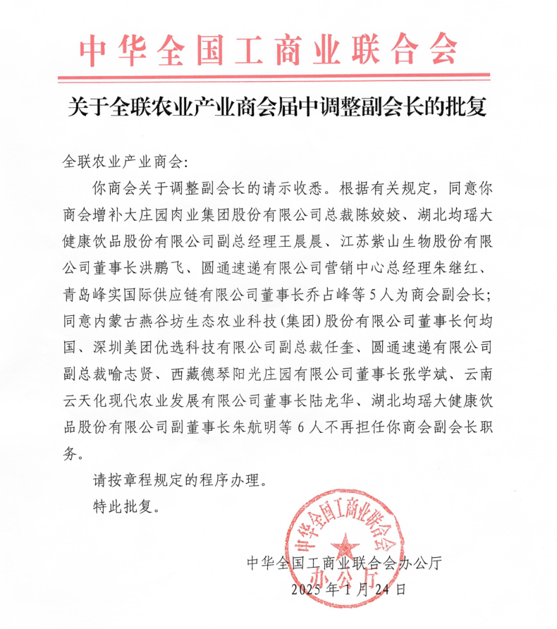 在大會(huì)正式召開之前,全國工商聯(lián)農(nóng)業(yè)產(chǎn)業(yè)商會(huì)還召開了第四屆第四次理事會(huì)、第七次常務(wù)理事會(huì)暨第九次會(huì)長(zhǎng)辦公會(huì)。會(huì)議匯報(bào)了2024年商會(huì)工作情況及2025年工作計(jì)劃,并審議通過了新增及調(diào)整副會(huì)長(zhǎng)人員名單,分支機(jī)構(gòu)成立的申請(qǐng)和論壇活動(dòng)管理制度等事項(xiàng),并傳達(dá)全國工商聯(lián)沈瑩書記一行調(diào)研商會(huì)時(shí)的講話要點(diǎn)。大莊園集團(tuán)總裁陳姣姣當(dāng)選全國工商聯(lián)農(nóng)業(yè)產(chǎn)業(yè)商會(huì)副會(huì)長(zhǎng)。