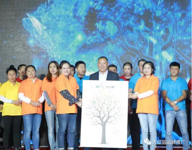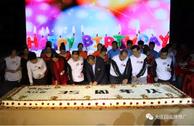 長3米5的35周年生日蛋糕推至臺(tái)前,它代表莊園35年的事業(yè)步步高升,蒸蒸日上?,F(xiàn)場700余名員工集體合唱《生日歌》,并且大莊園全體員工為董事長準(zhǔn)備了一棵由每一位莊園員工的指紋組成的莊園樹。“一棵樹,一家人”代表著所有莊園人在大莊園這棵大樹下吸取養(yǎng)分,茁壯成長。